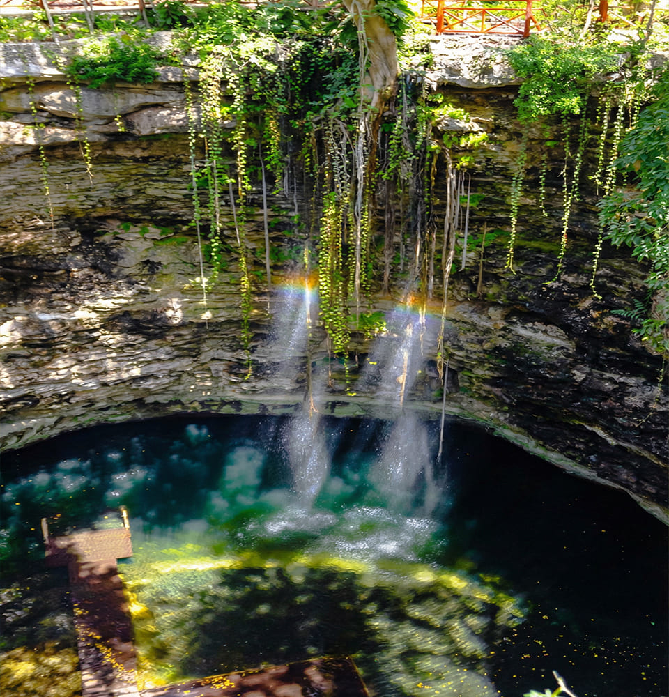 Este cenote se distingue por su estructura semiabierta que permite que la luz solar bañe el interior, creando un efecto visual espectacular con tonos vibrantes de azul. La gran abertura natural en el techo ofrece un juego de luces perfecto para los amantes de la fotografía. Dentro, verás estalactitas que contrastan con las raíces que cuelgan desde la superficie, un entorno que invita a sumergirte en calma y contemplación.